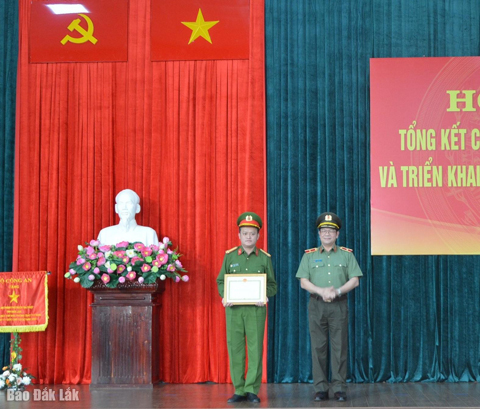 Thiếu Tướng Lê Vinh Quy, Giám đốc Công an tỉnh trao Bằng khen của UBND tỉnh cho Trung tá Thái Khắc Chính, Phó Trưởng Công an thành phố đã có thành tích xuất sắc đột xuất trong công tác phòng chống tội phạm tham ô tài sản.