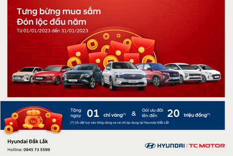 Mừng Xuân Quý Mão đang tới gần, Hyundai Đắk Lắk mang đến cho tất cả khách hàng mua và nhận xe trong tháng 01/2023 chương trình ưu đãi siêu hấp dẫn chỉ có trong Tết này.