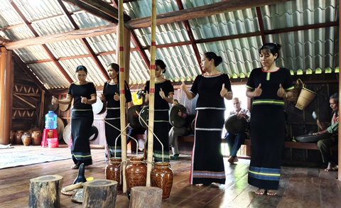 Diễn tấu cồng chiêng tại buôn Tơng Jú (xã Ea Kao, TP. Buôn Ma Thuột).