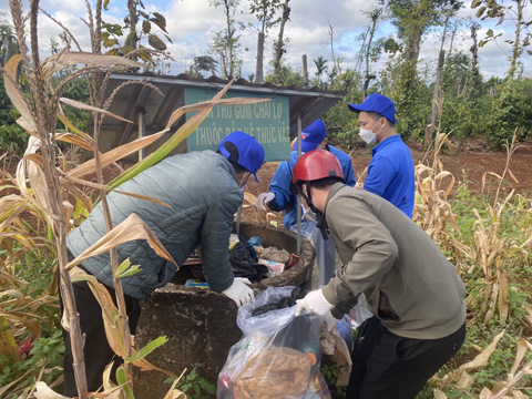 Đoàn viên, thanh niên xã Quảng Tiến (huyện Cư M'gar) thu gom vỏ chai thuốc bảo vệ thực vật đã qua sử dụng để đi tiêu hủy.