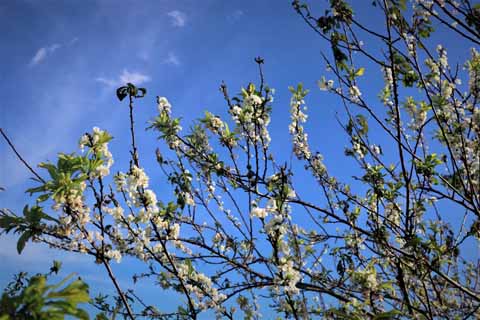 Dưới nền trời xanh, những bông hoa mận khoe sắc trắng tinh khôi.