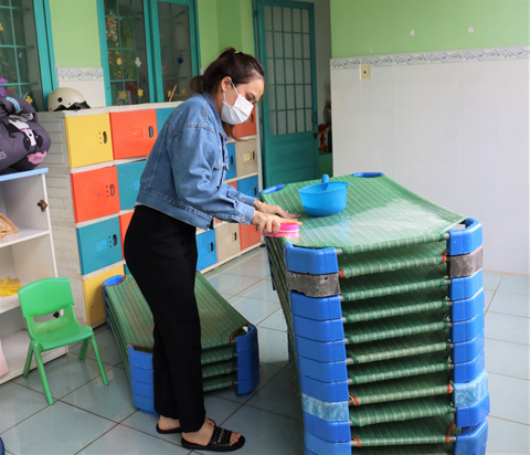 Giáo viên Trường Mầm non Ea Kao (xã Ea Kao, TP. Buôn Ma thuột) vệ sinh giường nằm, chăn màn tránh nguy cơ lây bệnh thủy đậu cho trẻ