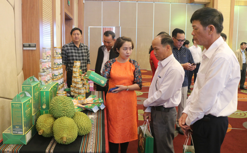 Đại biểu tham quan gian hàng trưng bày sản phẩm sầu riêng sấy thăng hoa của hội viên giới thiệu tại đại hội.