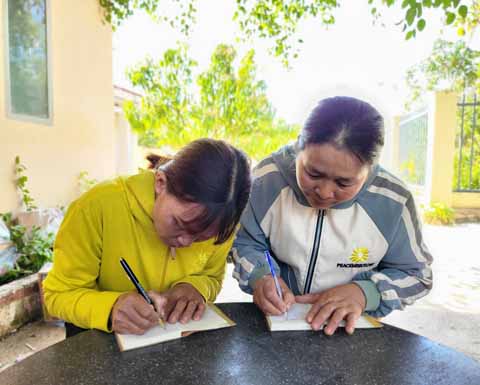 Bà Lang Thị Ứng (bên phải) và chị Lang Thị Sách viết chữ thành thạo sau 6 năm học lớp xoá mù