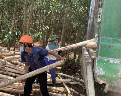 Hơn 12 giờ trưa, chuyến xe thứ hai đã xong, mọi người trong đội tranh thủ nghỉ ngơi và ăn trưa để chờ chuyến sau. Bữa cơm ăn vội của những người “phu keo” cũng chỉ là cơm nắm, ít cá khô và chai nước chuẩn bị từ sáng sớm mang theo. Năm nay 23 tuổi nhưng chị May đã có ba người con. Nhà nghèo, không có đất canh tác nên quanh năm chị theo chồng làm công việc thu hoạch keo. Tùy vào diện tích rừng keo thu hoạch, tổ của chị May thường có từ 10 - 15 người, làm công việc cắt cây, phát cành, bóc vỏ, bốc vác và vận chuyển. Tiền công được trả tùy theo năng lực và công sức họ bỏ ra. Thường thì cánh đàn ông được trả công cao hơn, bởi nhiều việc nặng phải đến tay họ, còn phụ nữ thu nhập thấp hơn bởi việc nhẹ nhàng hơn, trung bình mỗi ngày 200.000 – 250.000 đồng, song cũng bấp bênh ngày có ngày không. Mỗi ngày có việc làm, vợ chồng chị May kiếm được hơn 700.000 đồng, nên anh chị luôn động viên nhau tranh thủ thời tiết thuận lợi tích cực lao động, chi tiêu tiết kiệm để bù vào những tháng mưa gió kéo dài không có việc.