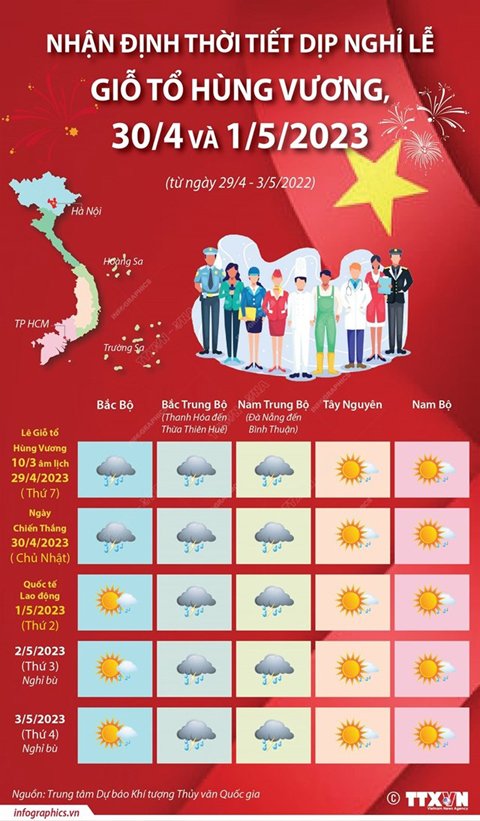 Dự báo thời tiết dịp nghỉ lễ Giỗ tổ Hùng Vương, 30/4 và 1/5