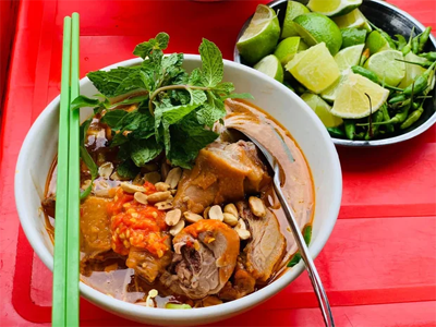 Vì tô mì Quảng ở đây có nước dùng đậm đà, màu đỏ cam bắt mắt với nhiều củ sắn và hành tây được xắt nhỏ hầm cùng với nhau. Linh hồn của món ăn này là sườn non được ninh nhiều giờ cho mềm tơ để những tinh túy hòa vào nước dùng. Ăn cùng đậu phộng rang, đặc biệt là nhiều rau thái nhỏ mới chuẩn bài.
