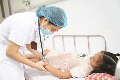 Bác sĩ thăm khám cho một bệnh nhi sốt xuất huyết điều trị tại Trung tâm Bệnh Nhiệt đới - Bệnh viện Nhi Trung ương.