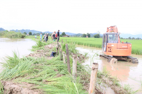 Nhân dân xã Buôn Triết (huyện Lắk) đang gia cố lại đoạn bờ sông Krông Na bị sạt lở khiến nước sông tràn vào cánh đồng gây ngập lụt