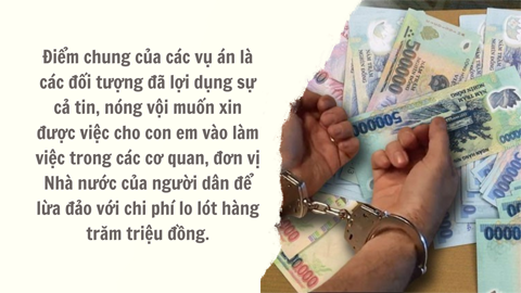 Điểm chung của các vụ án là các đối tượng đã lợi dụng sự cả tin, nóng vội muốn xin được việc cho con em vào làm việc trong các cơ quan, đơn vị Nhà nước của người dân. Từ đó, các đối tượng thực hiện thủ đoạn quen biết với lãnh đạo, hứa hẹn xin việc giúp với chi phí lo lót hàng trăm triệu đồng.