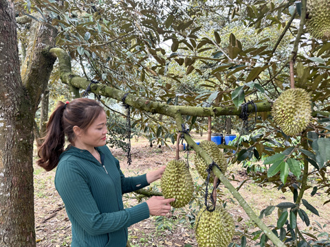 Gia đình chị Hậu bén duyên với cây sầu riêng từ cách đây 13 năm. Thời điểm đó, sau khi tham quan mô hình sầu riêng tại các tỉnh miền Tây Nam bộ, vợ chồng chị mua thử nghiệm vài cây giống về trồng ở vườn nhà. Sau khi trồng một thời gian, nhận thấy đây là loại cây trồng mới, phù hợp với điều kiện thổ nhưỡng của địa phương nên vợ chồng chị quyết định chuyển đổi 2 ha đất trồng cà phê xen tiêu kém hiệu quả sang trồng cây sầu riêng. Để “lấy ngắn nuôi dài”, tạo thu nhập thường xuyên, chị trồng thêm 300 gốc bơ cơm vàng. Hiện tại, vườn nhà chị có hơn 100 gốc sầu riêng; trong đó gần 50 cây đã cho thu hoạch, sản lượng bình quân 7 - 8 tấn quả/vụ, thu nhập bình quân 300 – 400 triệu đồng/năm.