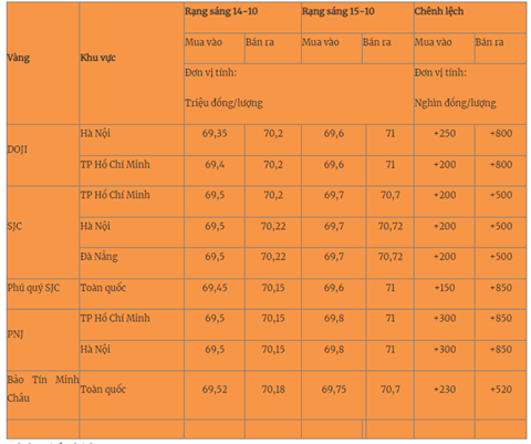 Giá vàng SJC ở khu vực Hà Nội và Đà Nẵng đang niêm yết mức 69,7 triệu đồng/lượng mua vào và 70,72 triệu đồng/lượng bán ra.