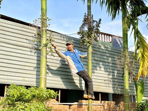 Giá cau tăng giúp những người làm nghề như anh Tự có được thu nhập đáng kể. “Các vựa thu mua bao nhiêu thì tôi lại đi cắt của người dân bấy nhiêu, chủ yếu lấy công làm lãi. Hằng ngày chịu khó đi tìm, tôi cũng lãi từ vài trăm nghìn đến cả triệu đồng từ công việc hái cau rồi đem về bán lại cho các vựa, cơ sở chế biến”, anh Tự bộc bạch. Trong quá trình thu hái, anh chỉ sử dụng một cái móc dây được đeo ở chân, tay bám chặt vào thân cây còn chân đẩy phần thân lên. Phút chốc, những buồng cau nặng trĩu được đưa xuống đất một cách an toàn.