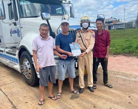 Cán bộ Cảnh sát giao thông tuyên truyền, hướng dẫn tài xế container vận chuyển sầu riêng chấp hành tốt luật Giao thông đường bộ.