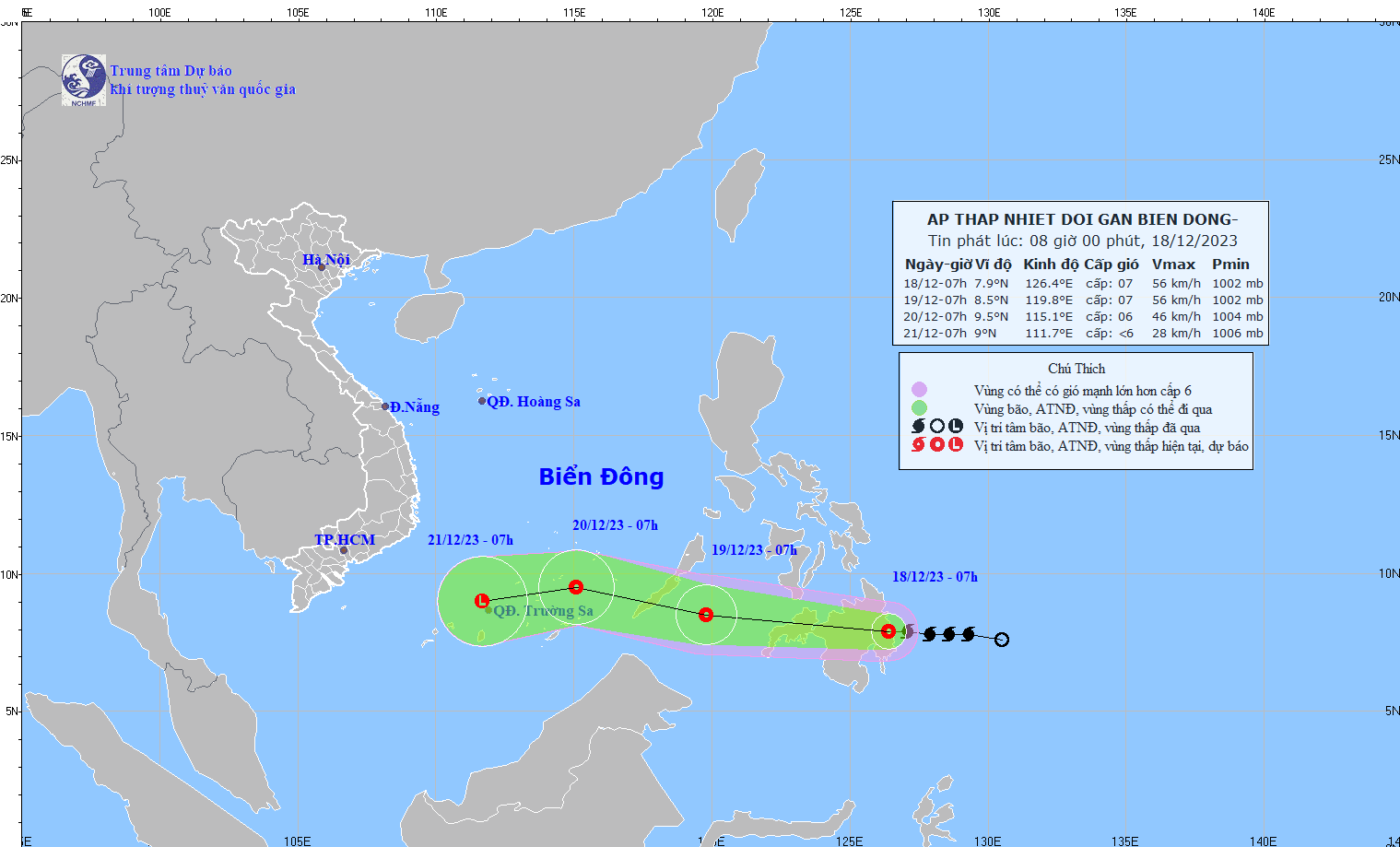 Đến 7h ngày 19/12, vị trí tâm áp thấp nhiệt đới ở vào khoảng 8,5 độ vĩ bắc; 119,8 độ kinh đông, trên vùng biển phía đông nam đảo Palawan (Philippines). Sức gió mạnh nhất vùng gần tâm áp thấp nhiệt đới mạnh cấp 6-7, giật cấp 9. Áp thấp nhiệt đới di chuyển theo hướng tây tây bắc, mỗi giờ đi được khoảng 25km.