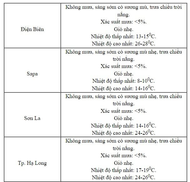 Khu vực Hà Nội: Không mưa, sáng sớm có sương mù và sương mù nhẹ, trưa chiều trời nắng. Nhiệt độ thấp nhất từ 16-18 độ; nhiệt độ cao nhất từ 24-27 độ.