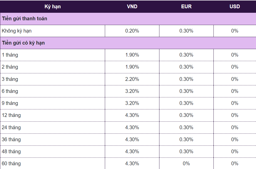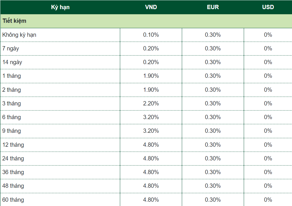 Với kỳ hạn 3 tháng, Vietcombank áp dụng mức lãi suất huy động là 2,2%/năm, kỳ hạn 6 - 9 tháng là 3,9%/năm và kỳ hạn từ 12 - 60 tháng là 4,3%/năm.