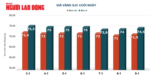 Tại Việt Nam, do sức mua – bán yếu nên giá vàng miếng SJC trong ngày 9-1 gần như bất động tại 74,5 triệu đồng/lượng.