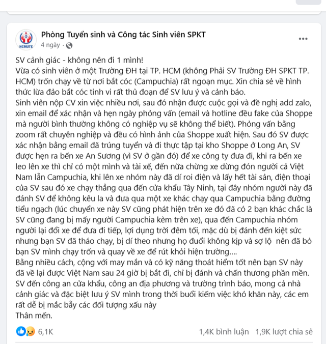 Mới đây, fanpage một trường ĐH đã đăng tải câu chuyện sinh viên một trường ĐH tại TP HCM bị lừa đảo việc làm, bị bắt sang Campuchia và trốn chạy trở về.