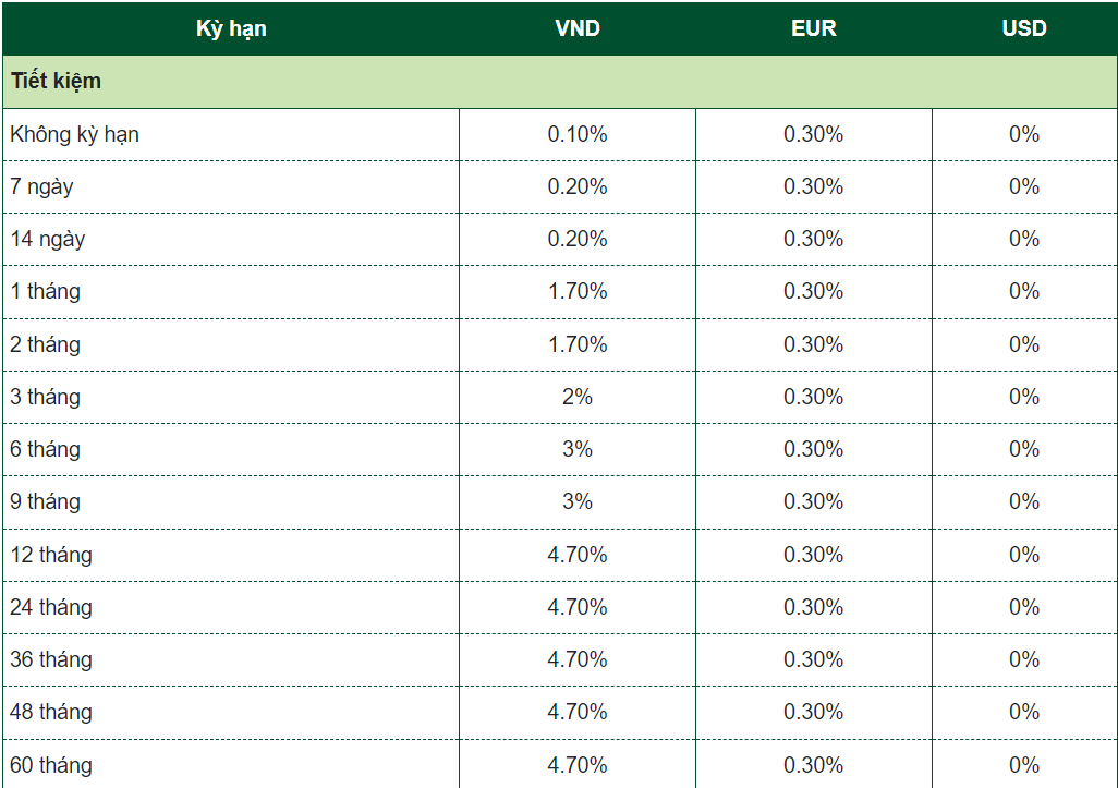Bảng lãi suất mới tại Vietcombank. Nguồn: VCB.