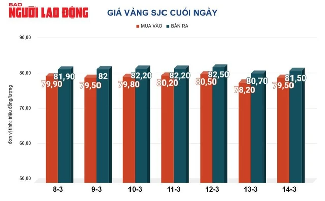 Tại Việt Nam, do sức mua gia tăng nên giá vàng SJC trong ngày 14-3 tăng 500.000 đồng/lượng, chốt cuối ngày tại 81,5 triệu đồng/lượng.