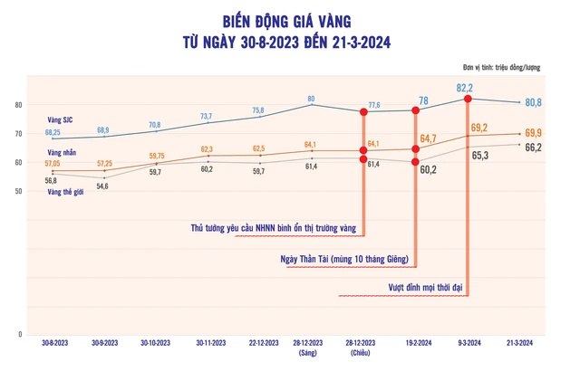 Diễn biến trên thị trường vàng khiến nhà đầu tư và người dân nắm giữ vàng "đau tim". Đầu tháng 3-2024, có thời điểm người dân đổ xô mua vàng khi giá vàng biến động loạn xạ và lập đỉnh lịch sử với mốc 82,2 triệu đồng/lượng. Tuy vậy, cũng có lúc giá vàng rớt hàng triệu đồng/lượng, chẳng hạn khi Thủ tướng chỉ đạo Ngân hàng Nhà nước (NHNN) có biện pháp can thiệt để bình ổn thị trường vàng cuối năm 2023.