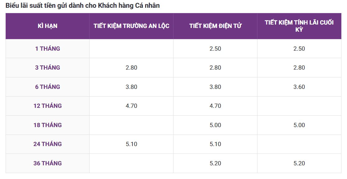 Theo biểu lãi suất huy động trực tuyến, lãi suất tiền gửi tại kỳ hạn 1 - 2 tháng là 3,1%/năm, kỳ hạn 3 - 5 tháng là 3,3%/năm, kỳ hạn 6 tháng là 4%/năm, kỳ hạn 7 - 11 tháng là 3,95%/năm, kỳ hạn 12 tháng là 4,15%/năm.