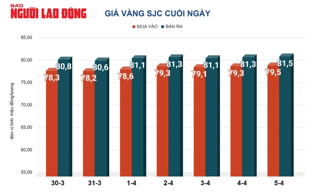 Tại Việt Nam, giá vàng SJC trong ngày 5-4 tăng 600.000 đồng/lượng, chốt cuối ngày tại 81,5 triệu đồng/lượng.