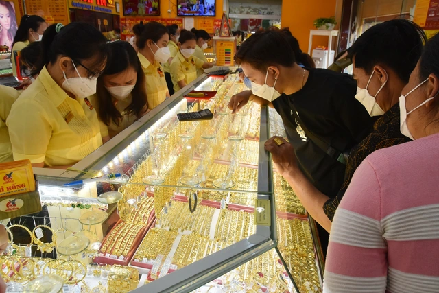 Không chỉ sốc vì giá vàng SJC nhảy vọt, nhiều người bất ngờ khi vàng nhẫn, vàng trang sức 24K các loại cũng tăng nhiều. Công ty SJC niêm yết mua vào 74,3 triệu đồng/lượng, bán ra 75,7 triệu đồng/lượng, tăng 1,4 triệu đồng/lượng so hôm trước. Công ty Bảo Tín Minh Châu còn giao dịch vàng nhẫn trơn lên tới 75,58 triệu đồng/lượng mua vào, 77,08 triệu đồng/lượng bán ra, tăng 1,9 triệu đồng/lượng.