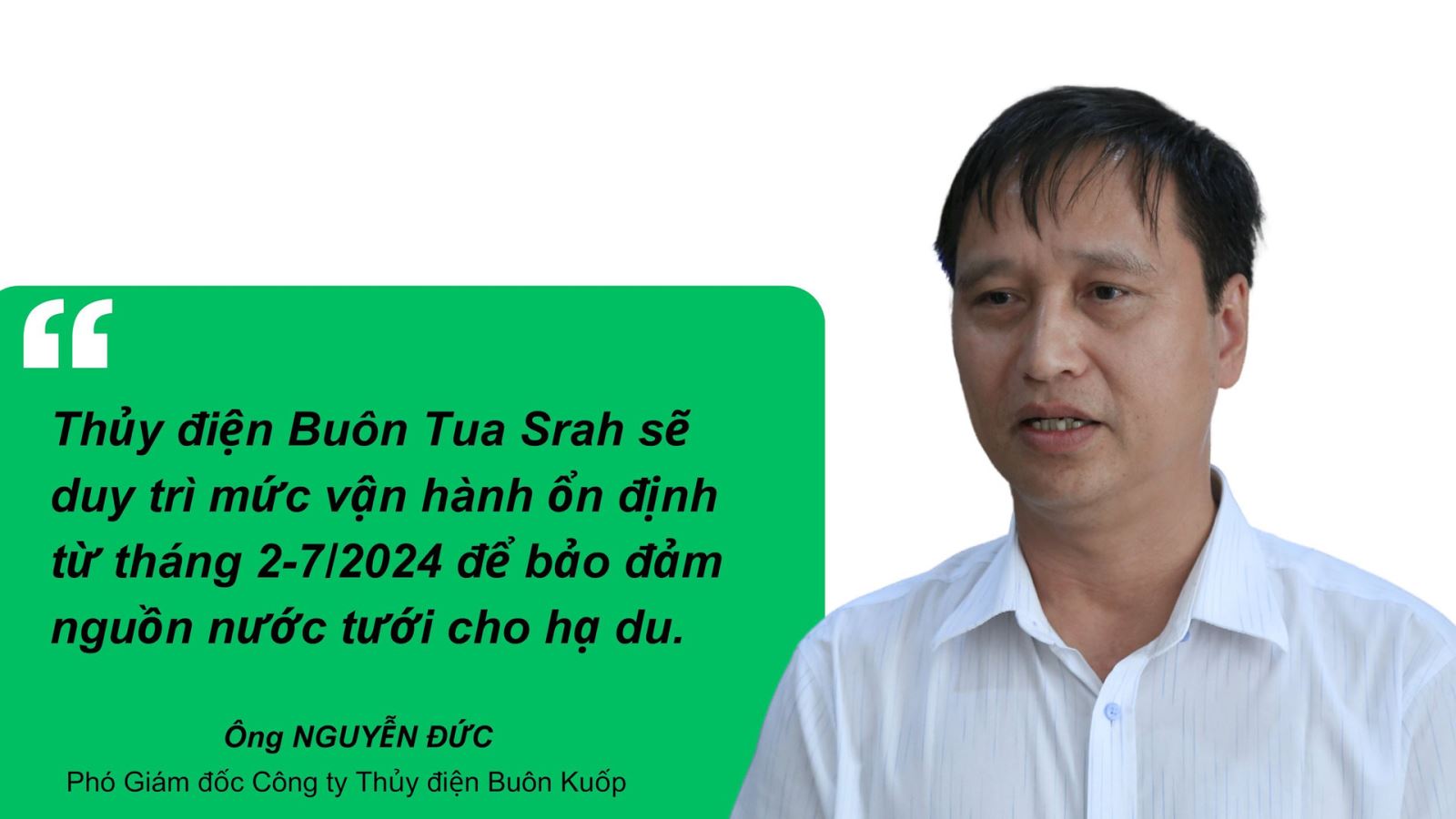 Sau khi thống nhất với địa phương, Công ty Thủy điện Buôn Kuốp đã tổ chức vận hành tổ máy xả nước về hạ du với lưu lượng tối thiểu 80m3/giây, liên tục 12 tiếng, bắt đầu từ khoảng 15h hàng ngày. Thời gian vận hành được áp dụng từ tháng 2 - 7/2024.