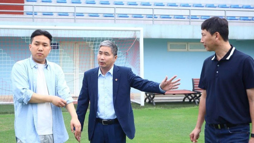 Ông Kim Sang Sik (ngoài cùng, bên phải) thăm cơ sở tập luyện của VFF sau khi đặt chân đến Việt Nam. Ảnh: VFF.
