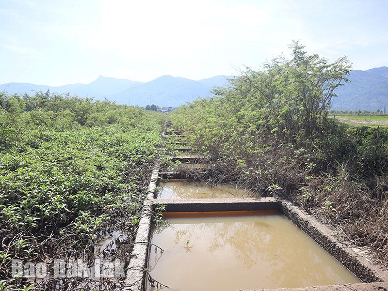 Hệ thống kênh dẫn chính từ hồ Lắk vào cụm đầu mối trạm bơm buôn Mă, xã Bông Krang bị cây mai dương, cỏ dại phủ kín