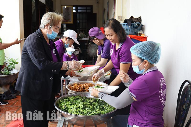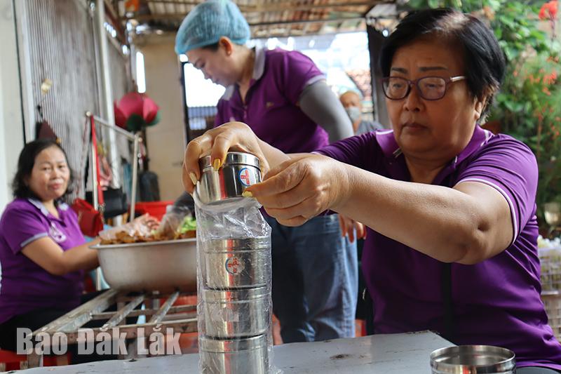 Tại bếp có “đôi bạn” cùng làm việc thiện, đều đặn mỗi ngày bà Nguyễn Thị Bé (66 tuổi) nhà ở xã Hòa Thắng (TP. Buôn Ma Thuột) đến chở bà Trần Thị Hằng (63 tuổi) đi tham gia nấu cơm từ thiện. Đã 5 năm nay, hai bà cùng nhau đồng hành đi khắp các bếp cơm trong thành phố, ở đâu cần người phụ giúp là có mặt. “Tôi không biết đi xe máy, may mắn tôi gặp chị Bé có chung niềm yêu thích nấu cơm thiện nguyện. Chúng tôi làm việc bằng cả trái tim chân thành, bởi cho đi là còn mãi”, bà Hằng tâm sự.