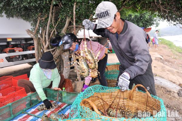 | Ngư dân Sông Cầu thu hoạch tôm hùm. |