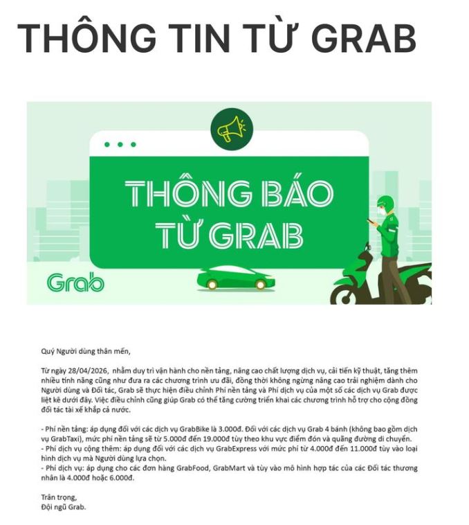 Hãng xe công nghệ Grab Việt Nam vừa thông báo điều chỉnh tăng một số loại phí trên nhiều dịch vụ, áp dụng từ ngày 28-4 tới. Việc này khiến chi phí mỗi chuyến xe và đơn hàng của người dùng tăng so với trước.