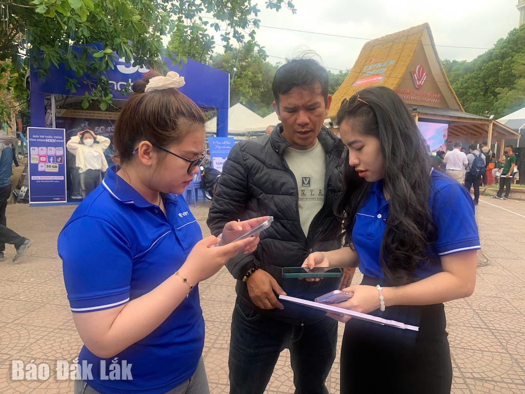 Nhân viên VNPT Đắk Lắk hướng dẫn người dân cài đặt các ứng dụng số.