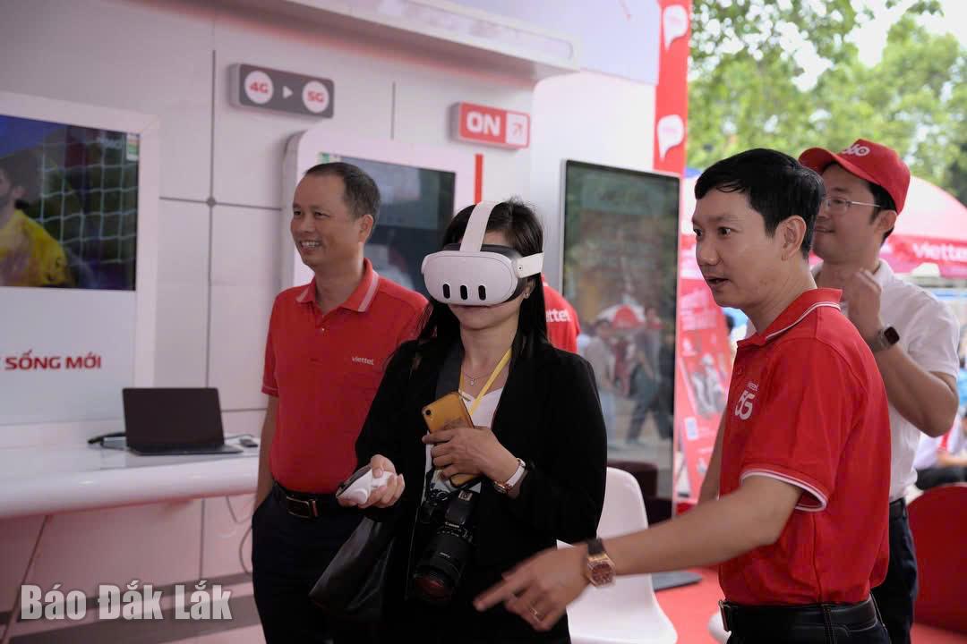 Khách hàng trải nghiệm du lịch thông minh qua kính VR và 5G tại gian hàng của Viettel Đắk Lắk tại Hội chợ triển lãm