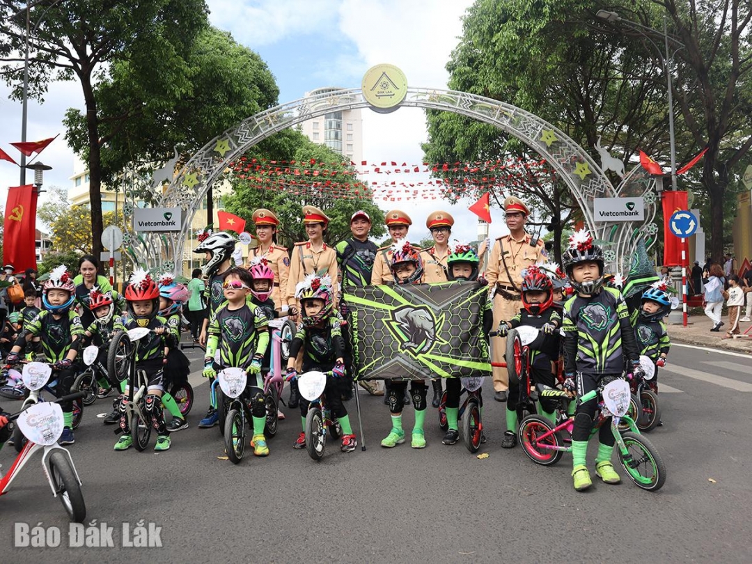Cán bộ, chiến sĩ Phòng Cảnh sát giao thông (Công an tỉnh) chụp hình cùng các em nhỏ tham gia diễu hành Lễ hội đường phố
