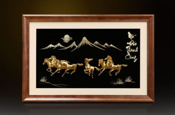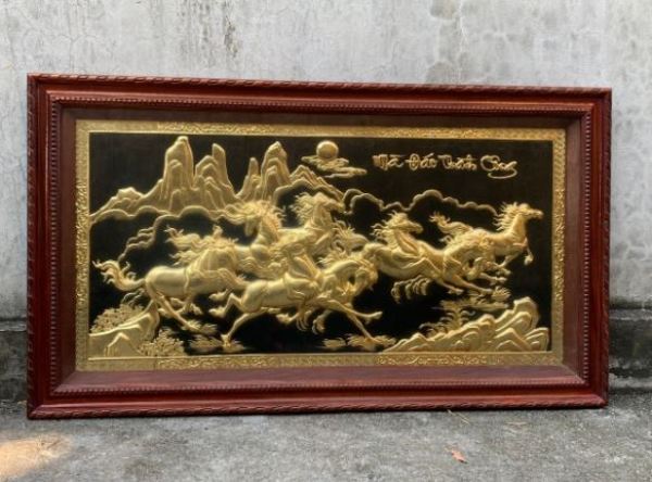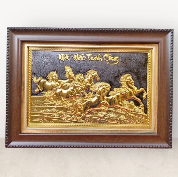 Tranh Mã Đáo Thành Công mạ vàng là tác phẩm nghệ thuật cao cấp, khắc họa hình ảnh bầy ngựa phi nước đại, biểu trưng cho ý chí vươn lên và khát vọng chinh phục thành công.