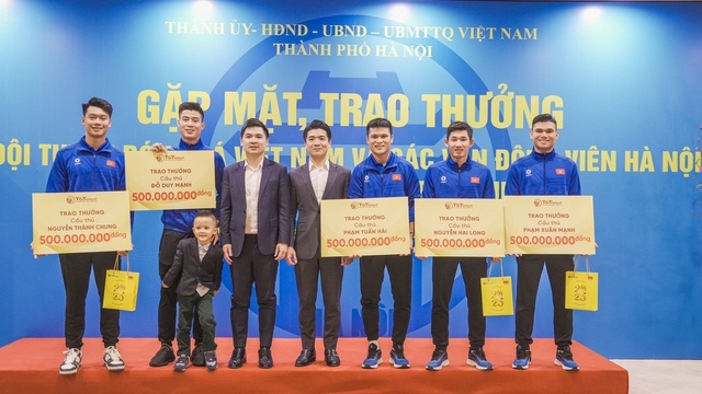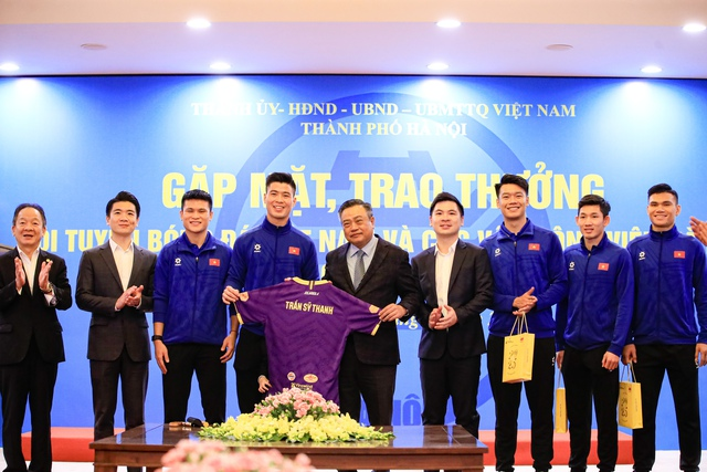 Chủ tịch UBND TP Hà Nội Trần Sỹ Thanh trao thưởng cho các tuyển thủ Việt Nam
