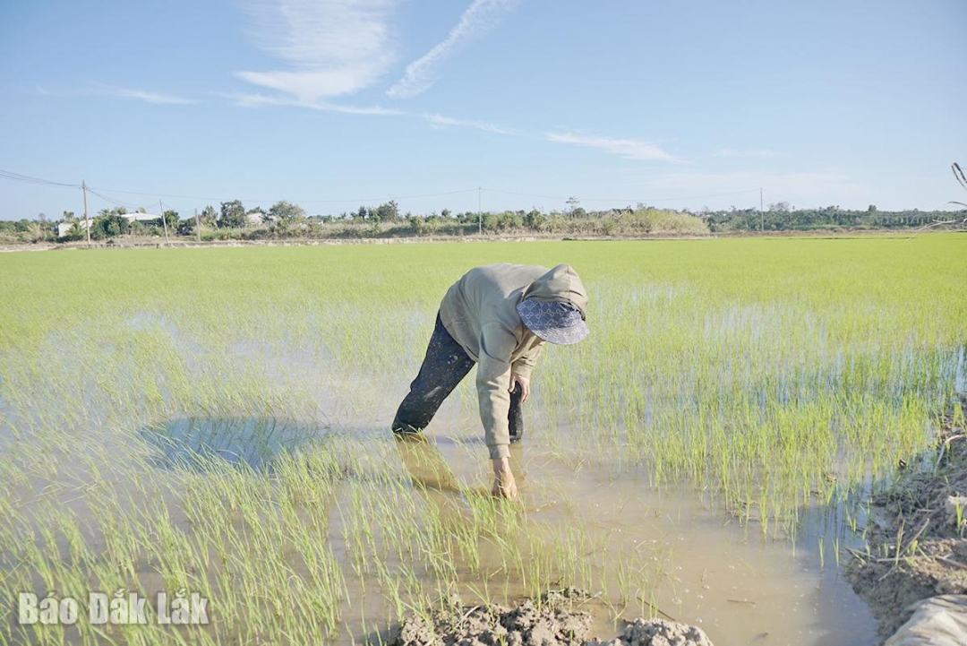 Tại cánh đồng rộng 100 ha thuộc thôn Quỳnh Ngọc 2 (xã Ea Na), ông Nguyễn Thế Sơn tất bật chăm sóc diện tích lúa vừa xuống giống được khoảng 20 ngày. Đây là vụ sản xuất quan trọng nhất trong năm nên ông tuân thủ khuyến cáo của ngành chức năng về việc vệ sinh đồng ruộng, lịch thời vụ... Vụ này, ông và nhiều bà con nông dân chọn giống lúa ST24 để sản xuất. Ưu điểm của giống lúa này cho gạo chất lượng, được thương lái ưu tiên khi thu mua.