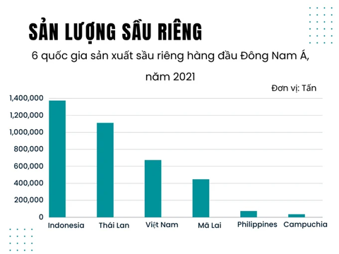 Theo số liệu thống kê năm 2021 (Manakit Somboon, 2022) Indonesia có sản lượng sầu riêng đứng đầu thế giới với khoảng 1,37 triệu tấn, tiếp theo là Thái Lan (1,11 triệu tấn). Việt Nam đứng thứ ba với 0,67 triệu tấn, tiếp theo là Malaysia (Mã Lai), Philippines, Campuchia. Mặc dù là quốc gia có sản lượng sầu riêng lớn nhưng sầu riêng Indonesia chủ yếu đáp ứng nhu cầu tiêu thụ nội địa, chỉ có một ít xuất khẩu sang Singapore, Malaysia và Trung Quốc nên sầu riêng Indonesia hầu như không cạnh tranh với các nước trong khu vực.