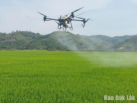 | Máy bay không người lái được sử dụng trên những cánh đồng mẫu lớn ở Đắk Lắk. Ảnh: Nguyễn Xuân |