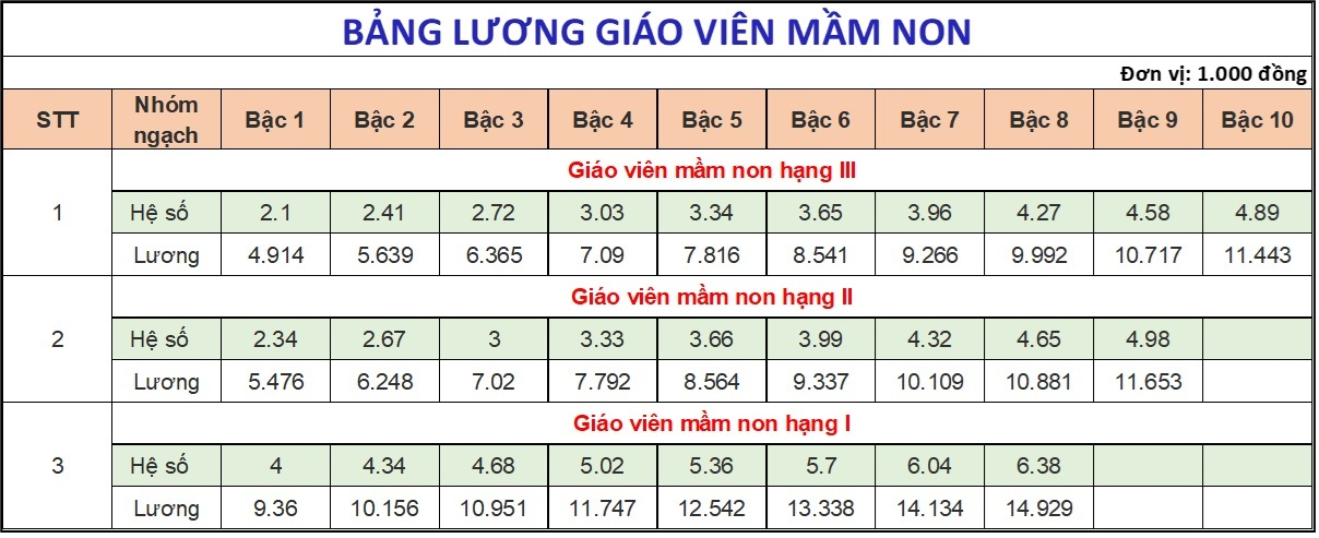 Do đó, trong năm 2025, mức lương của giáo viên vẫn áp dụng mức 2,34 triệu đồng/tháng theo Nghị định 73/2024/NĐ-CP và bảng lương giáo viên 2025 vẫn giữ nguyên như năm 2024. Cụ thể: