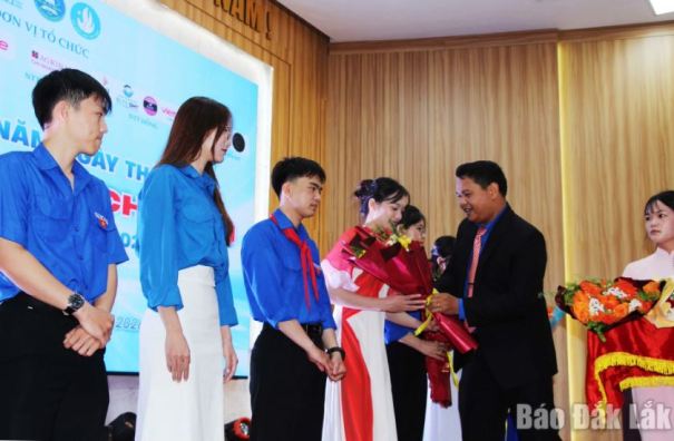 Bí thư Đoàn Trường Đại học Tây Nguyên Y Cuôr Bkrông trao giấy khen cho các cán bộ Đoàn, Hội xuất sắc.