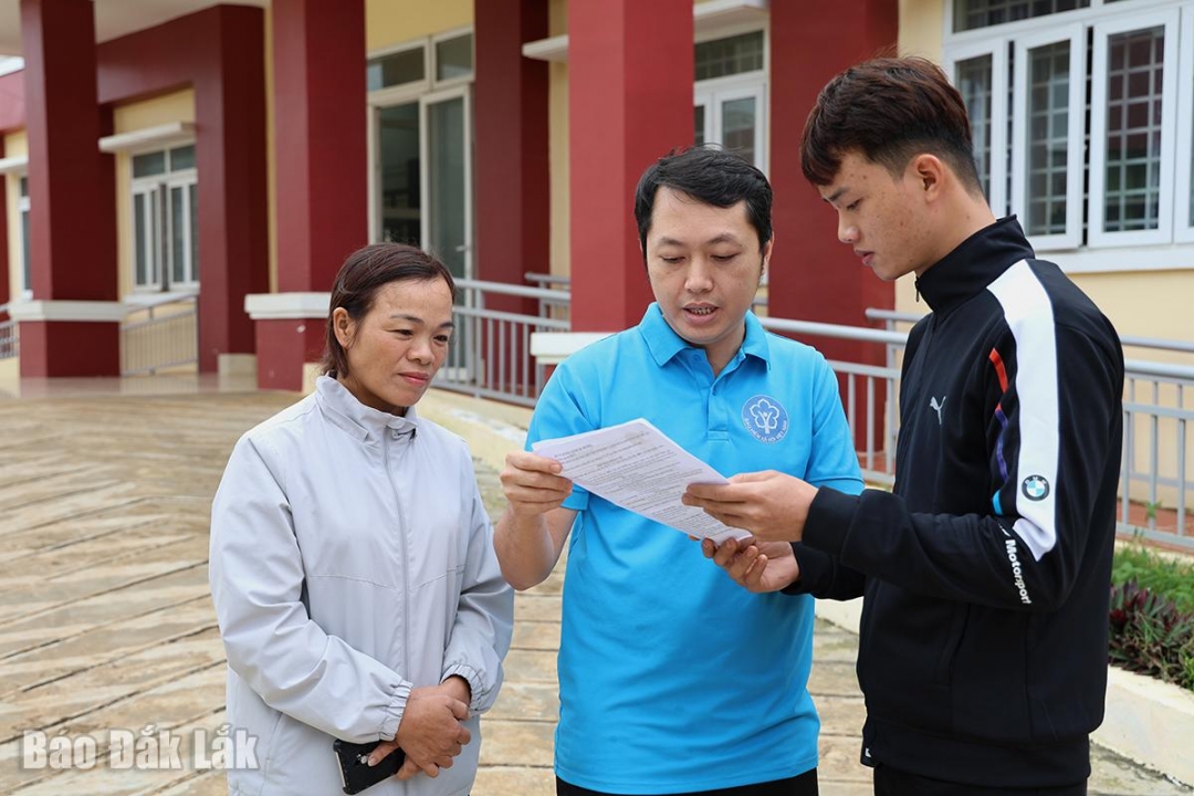 Cán bộ Bảo hiểm xã hội huyện Krông Pắc hướng dẫn về các chính sách hỗ trợ người lao động ở xã Ea Kênh tham gia bảo hiểm xã hội tự nguyện