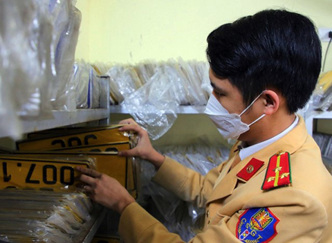 Cán bộ CSGT làm nhiệm vụ cấp đổi biển số xe cho người dân. Ảnh: VGP.