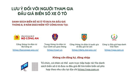 Theo kế hoạch, ngày 20/8/2023 Bộ Công an tổ chức đấu giá biển số xe ô tô (Phiên thứ nhất). Việc đấu giá được thực hiện hoàn toàn trên môi trường mạng, người dân cần lưu ý các thao tác thực hiện theo hướng dẫn từ Cục Cảnh sát giao thông.